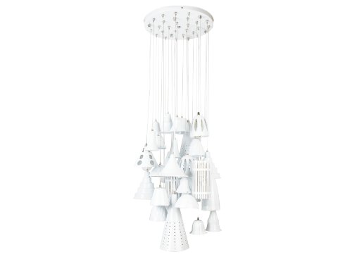 - Assorted metal lamp shapes cascading down from the central white ceiling rose