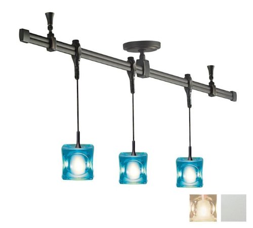 Finish:Silver, Glass:Clear, Light Bulb:(3)40w T4 G9 120v Halogen Nora Rail Kit, 4' Straight Rail & (3) Pendants w/ Mega Ice Cube Glass Includes: (1) 4' Rail [NRS90-P04] (1) 3' Power Stem [NRS90-P11] (1) Canopy for Power Stem [NRS90-P13], (2) 3' Standoff Supports [NRS90-N73] (3) Pendant Assemblies [NRS19-450] (3) Mega Ice Cube Glasses [NRS80-411] (3) 40W G9 lamps Line Voltage. No transformer to worry about. Easily dimmed. Kit can accommodate additional fixtures and/or pendants up to 2400 watts. Fixtures, standoffs, and power stem/canopy are moveable and can be placed anywhere on the rail.