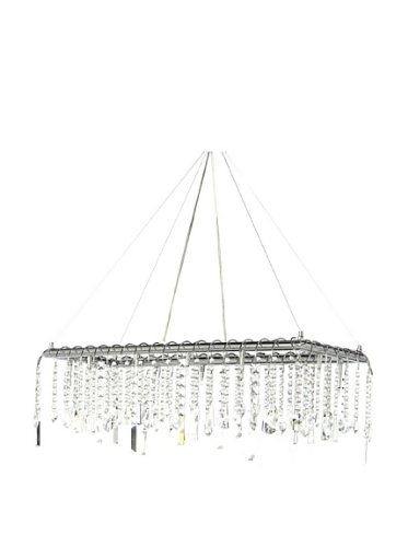 Select strands of crystals welded to a rectangular structure form the base of this unique chandelier. Lit with halogen bulbs, this lamp forms a dazzling presentation above any dining table.