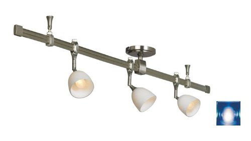 Finish:Brushed Nickel, Glass:Blue, Light Bulb:(3)40w T4 G9 120v Halogen Nora Rail Kit, 4' Straight Rail, (3) Mercure Fixtures w/ Madeleine Glass Includes: (1) 4' Rail [NRS90-P04] (1) 3' Power Stem [NRS90-P11] (1) Canopy for Power Stem [NRS90-P13], (2) 3' Standoff Supports [NRS90-N73] (3) Mercure Fixtures [NRS11-260] (3) Madeleine Glasses [NRS82-204] (3) 40W G9 lamps Line Voltage. No transformer to worry about. Easily dimmed. Kit can accommodate additional fixtures and/or pendants up to 2400 watts. Fixtures, standoffs, and power stem/canopy are moveable and can be placed anywhere on the rail.